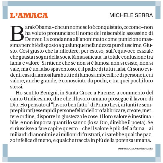E, per dirla tutta, comincia un articolo così: “Barak Obama, lui che un nome se l’è conquistato, eccome.” C’è qualcosa in questa frase che non mi convince, non lo so spiegare, la rileggo, poi rileggo il resto, e ritorno al silenzio, all’infelice pazzia che scuote i miei giorni e porta rispetto all’umanità di Serra Michele, agli inni sacri di Benigni Roberto e ha troppa stima per usare con leggerezza parole quali bellezza, felicità, giusto, uomo, Dio.